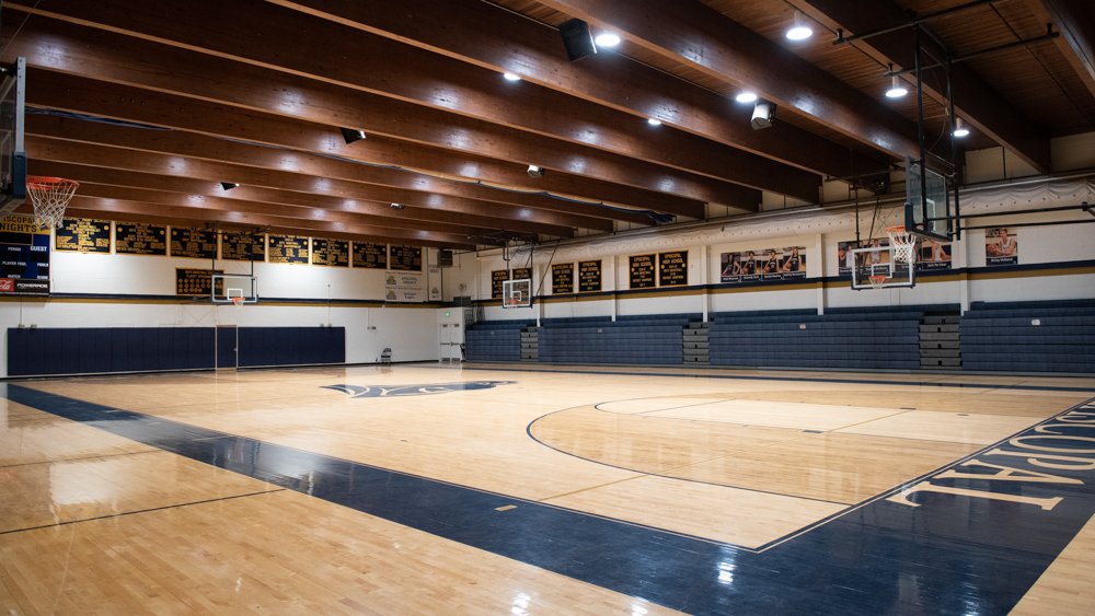 The Main Gym is a 23,378 square foot facility that is home primarily to physical education and boys and girls basketball. There are three locker room spaces and separate coaches offices, five adjacent classrooms, including “G5,” which is used as indoor team film study, team walk-through and fitness space, a multipurpose space with rubberized flooring, and a concession stand that services both gymnasiums. In addition, the Main Gym holds our main competition court for our basketball teams named in 2016 in memory of alumnae, Felisha Foster ‘88. The Main Gym can hold a max attendance of 700 people.