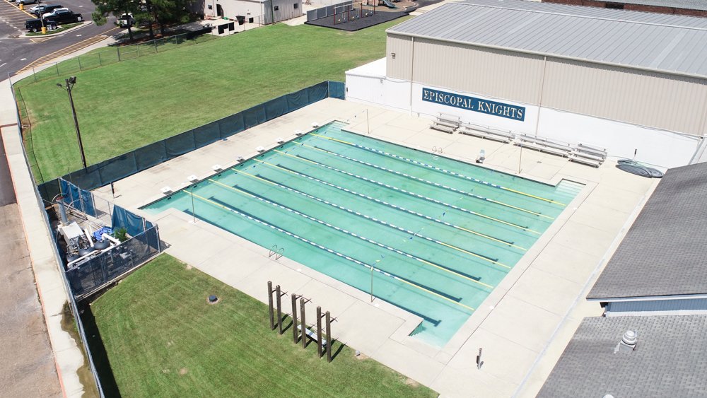 The Episcopal swimming pool is a 25-meter, eight-lane, heated outdoor pool that serves as the on-campus practice facility for the Episcopal Knights swim team. Additionally, physical education classes use the space for kayaking, fly fishing, swimming, and more throughout the year. The attached swim pavilion is an outdoor covered multi-use space that allows for drylands exercising, meeting space, non-severe weather shelter, two equipment closets, and two full-service locker rooms.