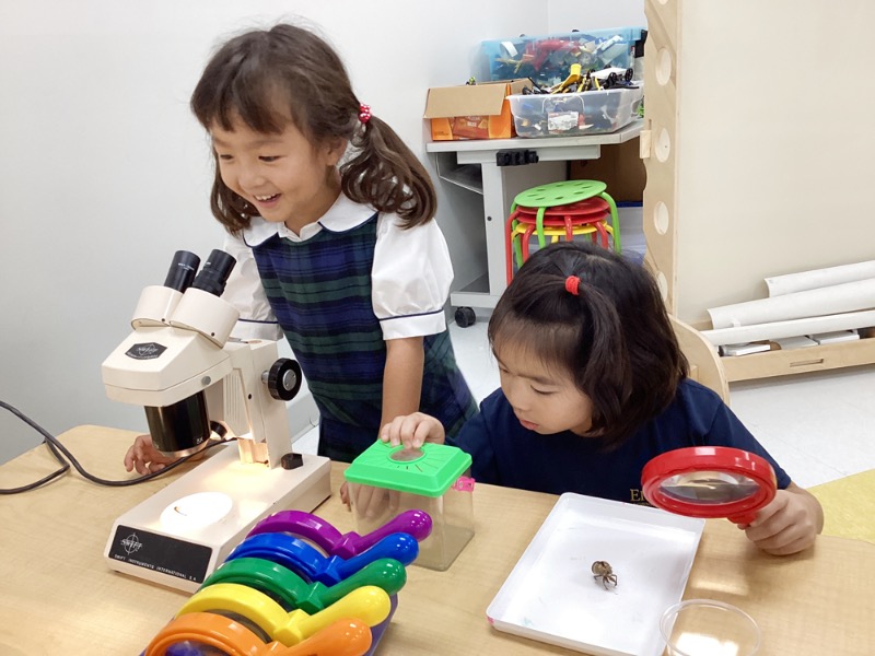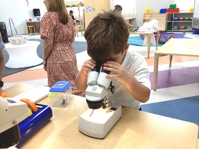 As students examined the cicada shells, teachers asked questions about shapes and colors. With their curiosity peaked students expanded their vocabulary with new words like burrow and insect. Like true little scientists, they made observations and inferences and learned to use a microscope. “The littles are really amazing,” says Hill of the excitement with which early childhood learners approach each lesson. The station was so successful with the kindergarteners that teachers also made it available for other Lower School students, including PreK-4.