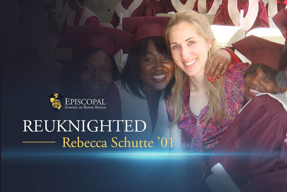 Flip through the 2001 Episcopal Accolade and you’ll find a photo of Rebecca Schutte ’01 presenting her honors thesis on the death of King Tut. As an Episcopal student, Schutte played in the band and was a member of the volleyball team. She enjoyed the volunteer requirements and the opportunity to get involved in the community. She was also an enthusiastic learner. Schutte describes herself as intellectually curious and someone who is curious about the world. At Episcopal, she found teachers and classmates that understood and supported that. “It was always ok to question and to have a curious mind and pursue a lot,” says Schutte, who looks back now with appreciation for the freedom and encouragement to explore.