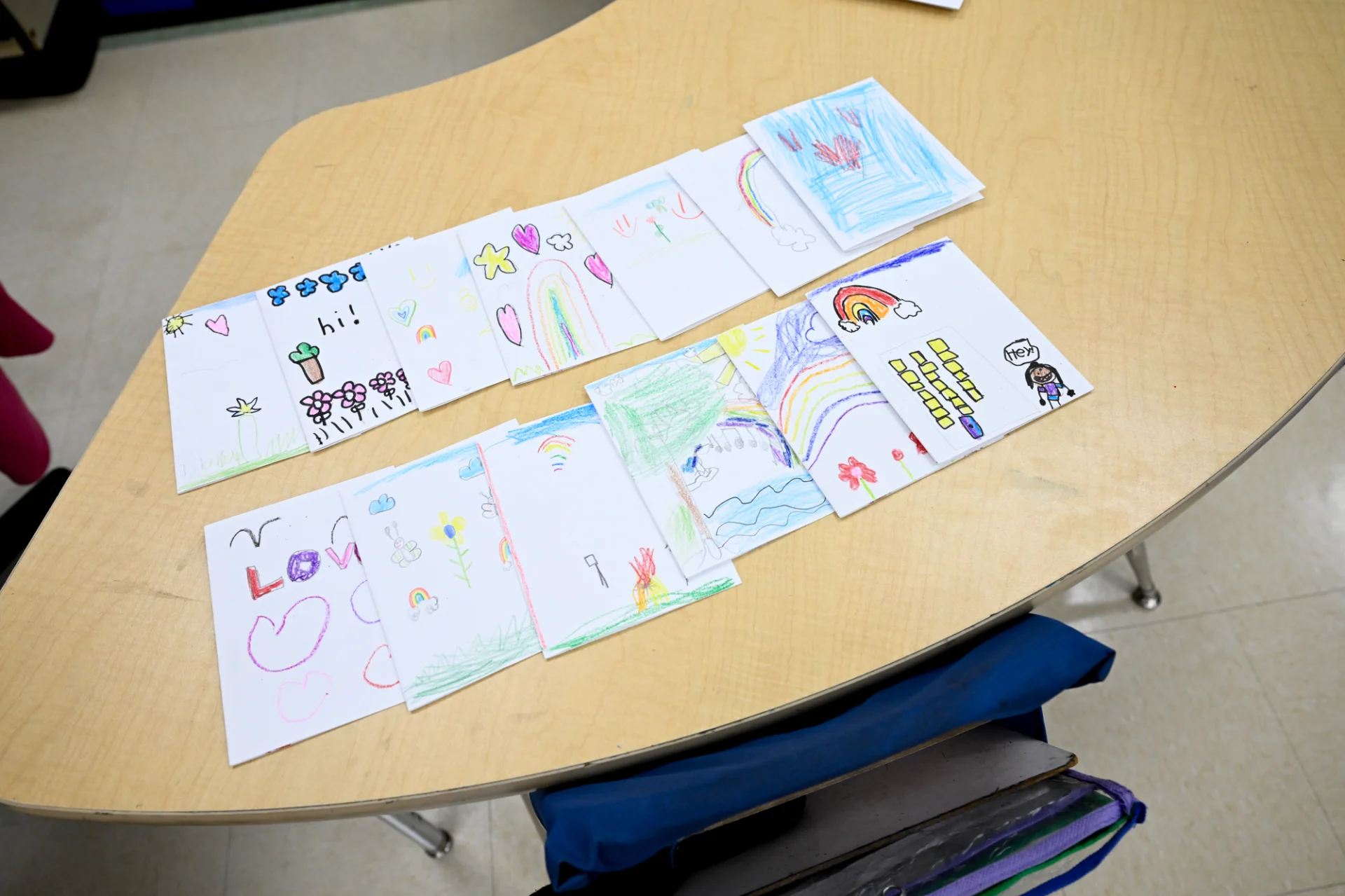 After showing her students the cards from her gift and sharing how important they were to her, she tasked the first graders with writing their own. In true Lower School style, students were enthusiastic about the project. Ultimately, 100 brightly colored, handwritten cards were made featuring butterflies, flowers, drawings and lots of love.