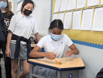 Those activities include events with catchy titles like Soapy Marbles, Pass the Orange and Ping Pong Bounce. Once a week during morning community time and afternoon flex each homeroom tackles a challenge with the hopes of making it to the grade level finals. The classrooms are abuzz with the sounds of students attempting to pick up soap-covered marbles with chopsticks or trying to identify their favorite Middle School teachers based solely on childhood photos. “It’s been great to see Middle School students running around, competing, and encouraging each other in the spirit of their COVID Olympics team,” says Engstrom.