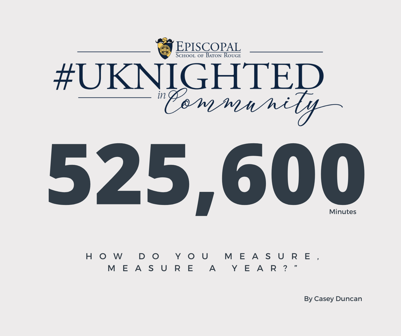 Here in the Episcopal School of Baton Rouge, we are UKNIGHTED in Community. This is not some lofty goal or pie in the sky fantasy. UKNIGHTED in Community is simply a statement of truth pointing out that which already exists. We are a community 525,600 minutes a year, and each and every person in this community is a valuable member with much to give and much to receive. Though our appearance changes from year to year as people move, students graduate, and more are welcomed, each member belongs to the whole.