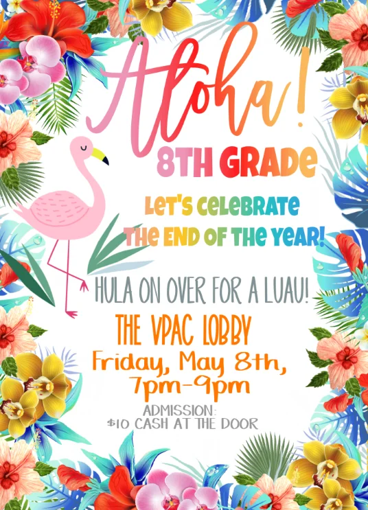 *Friday, May 8th. 7:00 - 9:00 PM. VPAC LOBBY. 8th-Grade Luau Dance.
