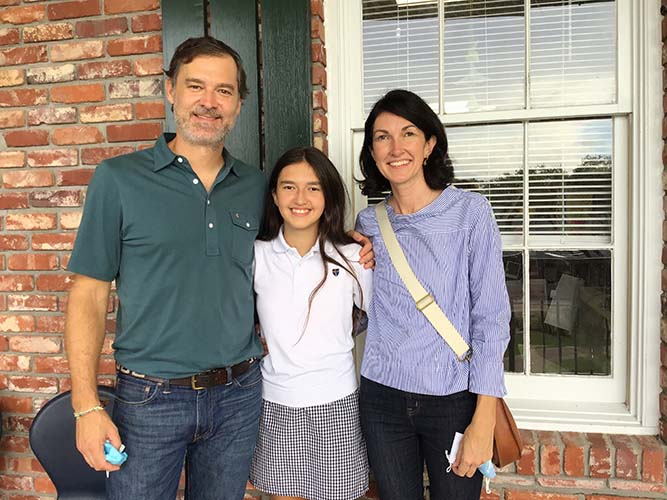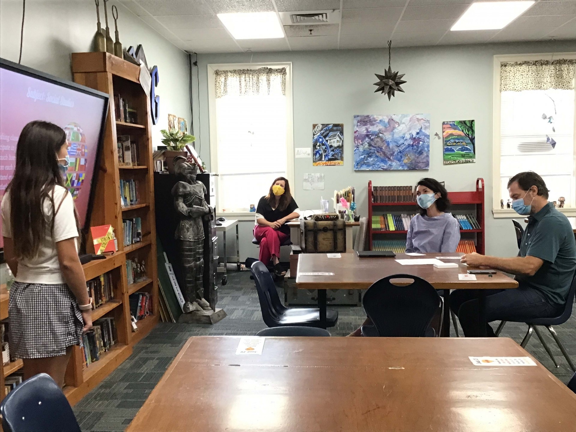 The student-led conferences provided the new Middle Schoolers the opportunity to show off their knowledge and their learning environment. Upon entering the classroom, Margaret pointed out highlights of the space, including the class lizard and where she sits each day. It also offered the families an opportunity to connect through student work. For example, Margaret shared a writing sample about one of her favorite memories. “This is one of my favorite memories too,” said her mom, Anna. John’s dad Laurence appreciated the opportunity to be on campus. “It’s nice to see your child in their learning environment,” he says.