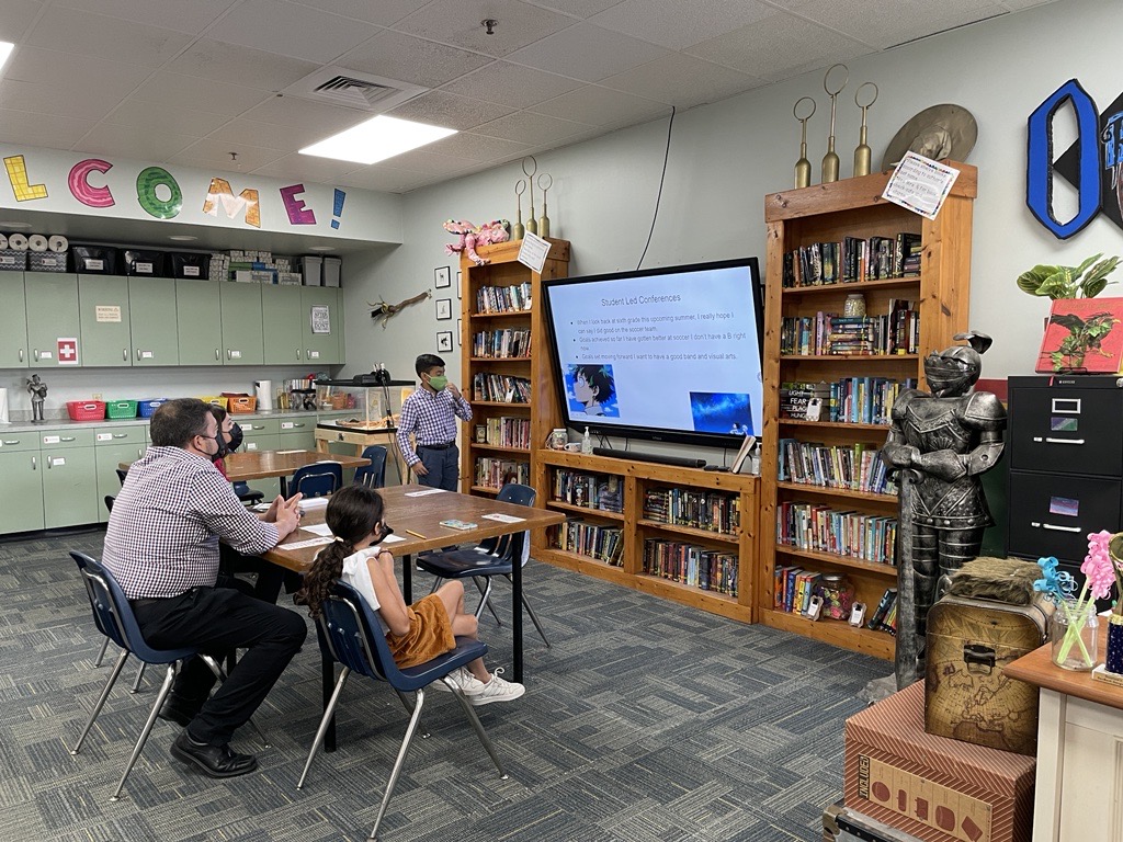 Before the conferences, sixth graders had three weeks to reflect on the first quarter of the school year. They created a slide presentation to share with families and teachers about their experiences. Students were asked to think about topics such as, What did you learn about yourself? Why are you succeeding in a subject or struggling in a subject? What classroom and extracurricular activities do you most enjoy?