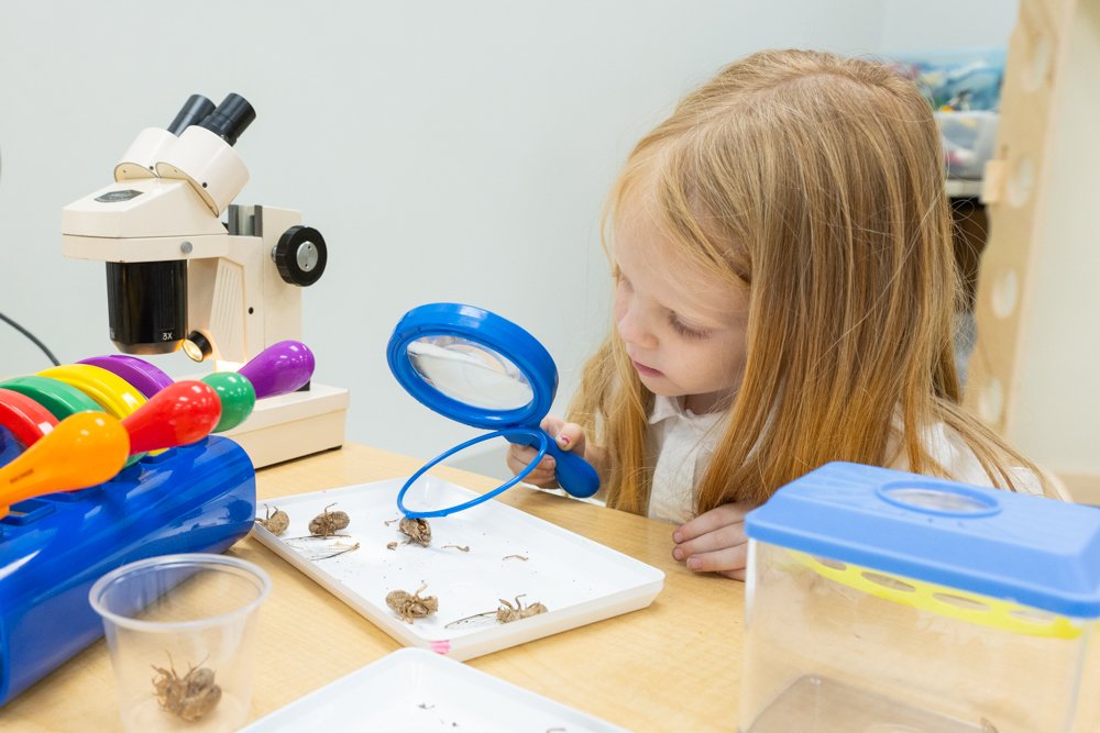 In addition to these formal science experiences, students are given ample free time to explore and process what they have learned. Whether it is sticking their hands into a slimy pumpkin at Halloween, balancing blocks to build a tall tower through trial and error, or pulling a molted exoskeleton of a cicada from a tree or discovering a butterfly chrysalis in the garden, these organic and natural experiences provide the foundation for children to become critical thinkers and problem solvers.