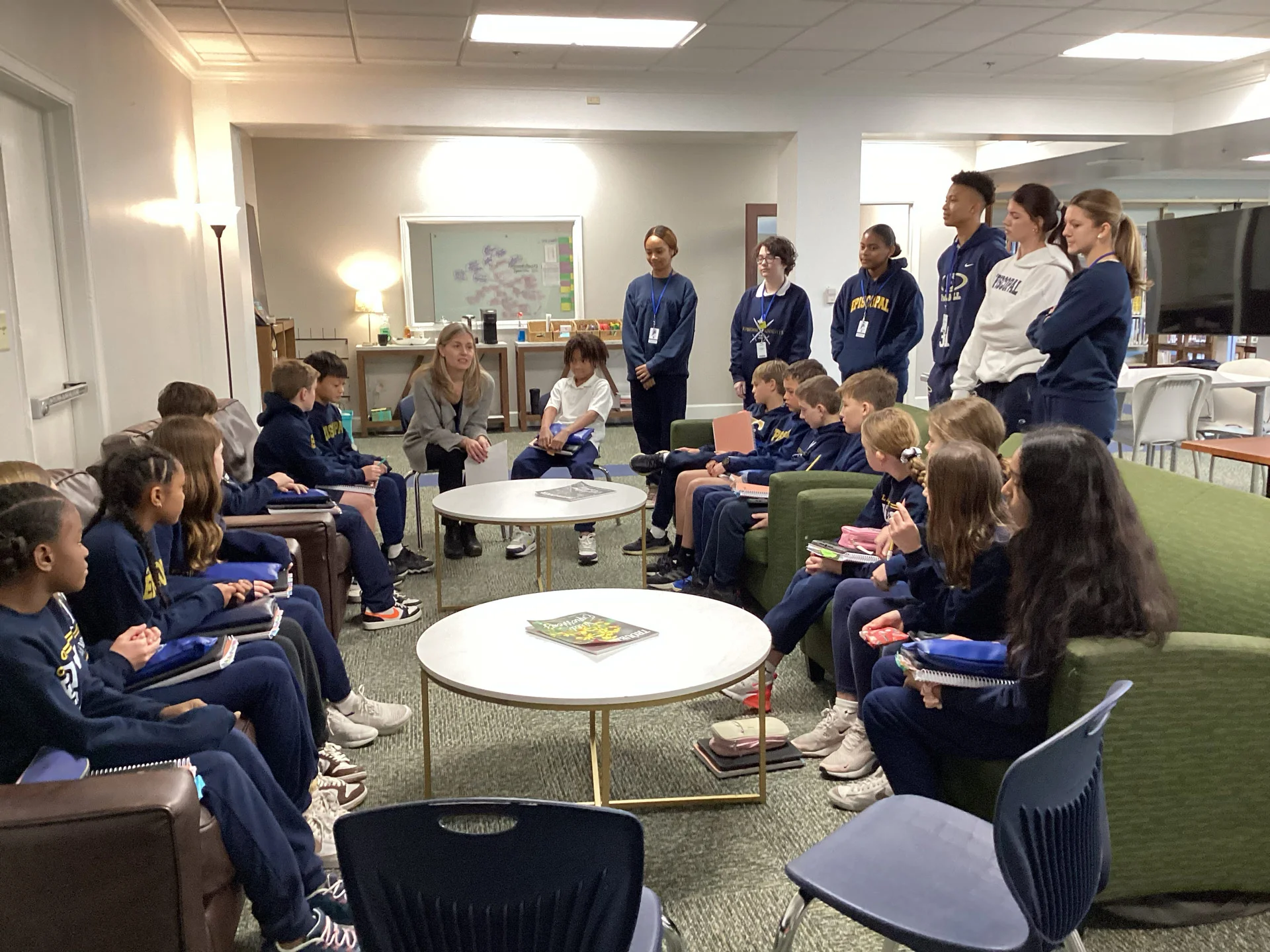 Sutcliffe was thrilled with the opportunity to expand the Academic Resource Center’s offerings. “The Fellows benefit when they have to exercise flexibility in working with different age groups, and students of all ages benefit from learning in community with their peers,” she says. Once the fifth graders arrived at the ARC, the younger students were placed into groups led by a Fellow. The Fellows patiently asked questions and guided discussions much like they do with their older peers.