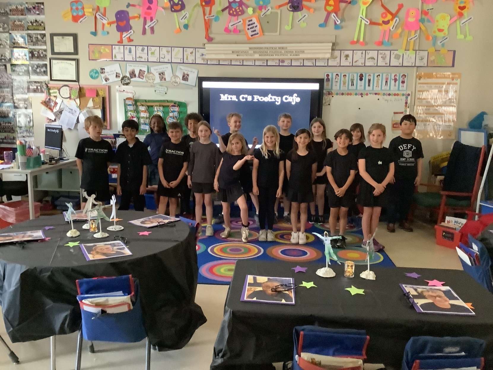 To mark the end of their writing unit on poetry, second graders hosted a Poetry Cafe. Since students are in the midst of their project-based unit on space, the cafe experience took on an out-of-this-world feel with space and astronaut-themed decorations. Second graders shared their favorite poems with families and friends, and everyone enjoyed treats to celebrate the occasion.