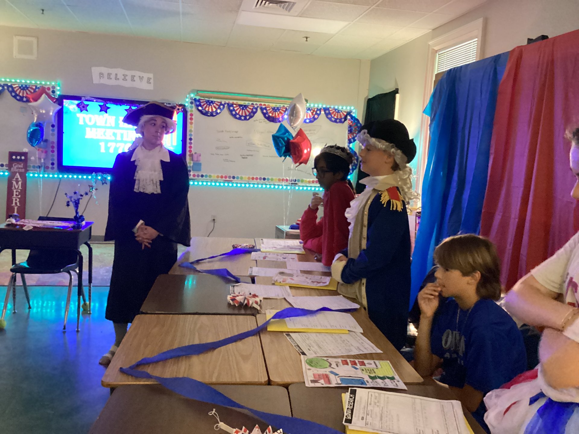 After studying the American Revolution, fifth graders tested their knowledge with an old-fashioned town hall meeting. Students dressed in red, white and blue or period attire representing characters such as Samual Adams, Benjamin Franklin, Martha Washington, Betsy Ross and King George. The enthusiastic debates of the Sugar Act, Stamp Act and Tea Act were an engaging and fun way for students to showcase all they have learned.