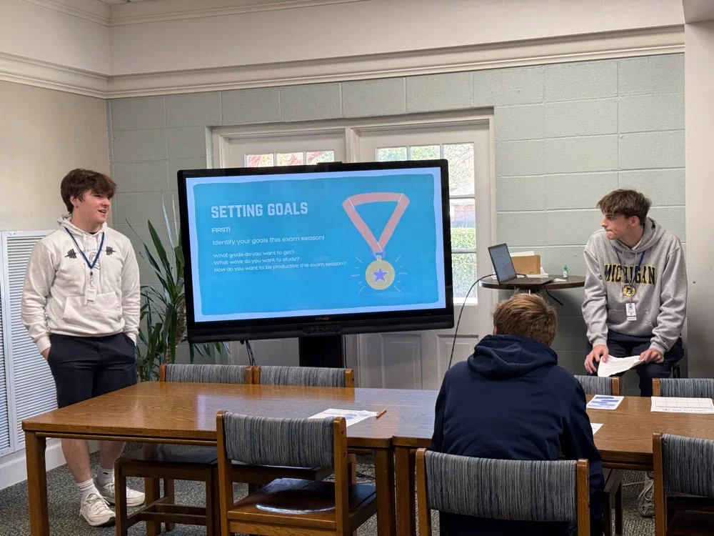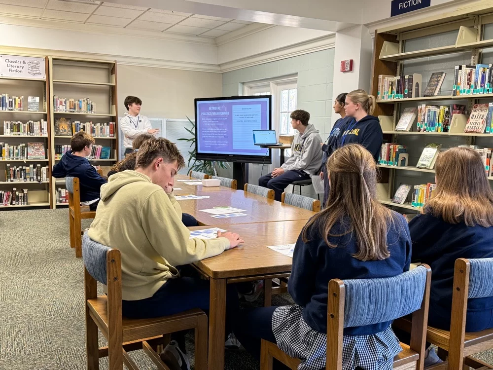 Throughout the school year, Academic Resource Center Fellows provide regular peer tutoring, and now, during exam season, they have stepped up their offerings. In advance of midterm/finals week, Fellows hosted ninth grade Exam Prep sessions using a presentation created by Fellows Zoey Hodges and Madeline Greene. As is the case with peer tutoring, Fellows can relate to the freshmen in a meaningful way as they know what it is like to prepare for numerous exams at the same time and the pressure this can create. Having a peer offer firsthand advice on what not to do and what to do in preparing for exams is a powerful and positive way to help students feel supported.